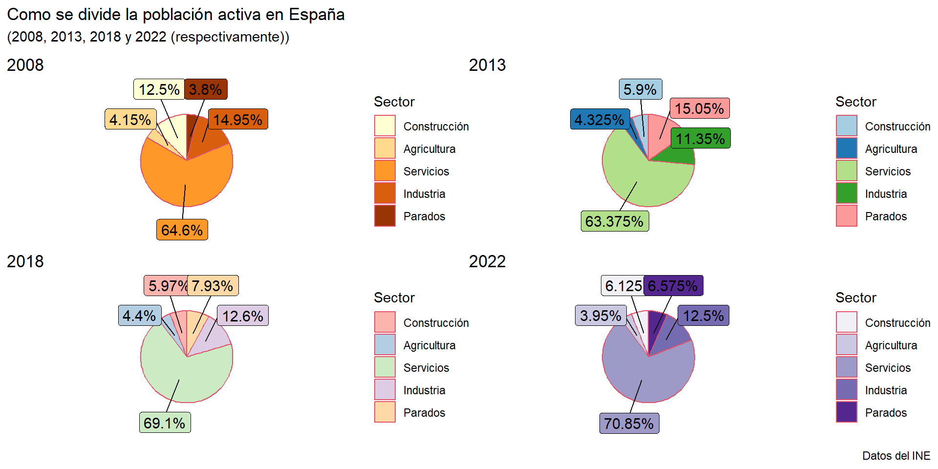 En este caso vamos a ver cómo se divide la población en activo Española a través de 4 sectores distintos más el porcentaje de parados por año. Lo veremos a través de 4 años distintos con un gráfico circular.