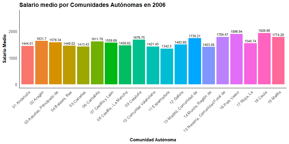 El siguiente gráfico de barras animado nos muestra la distribución salarial en España por comunidades autónomas desde 2006 hasta 2022.