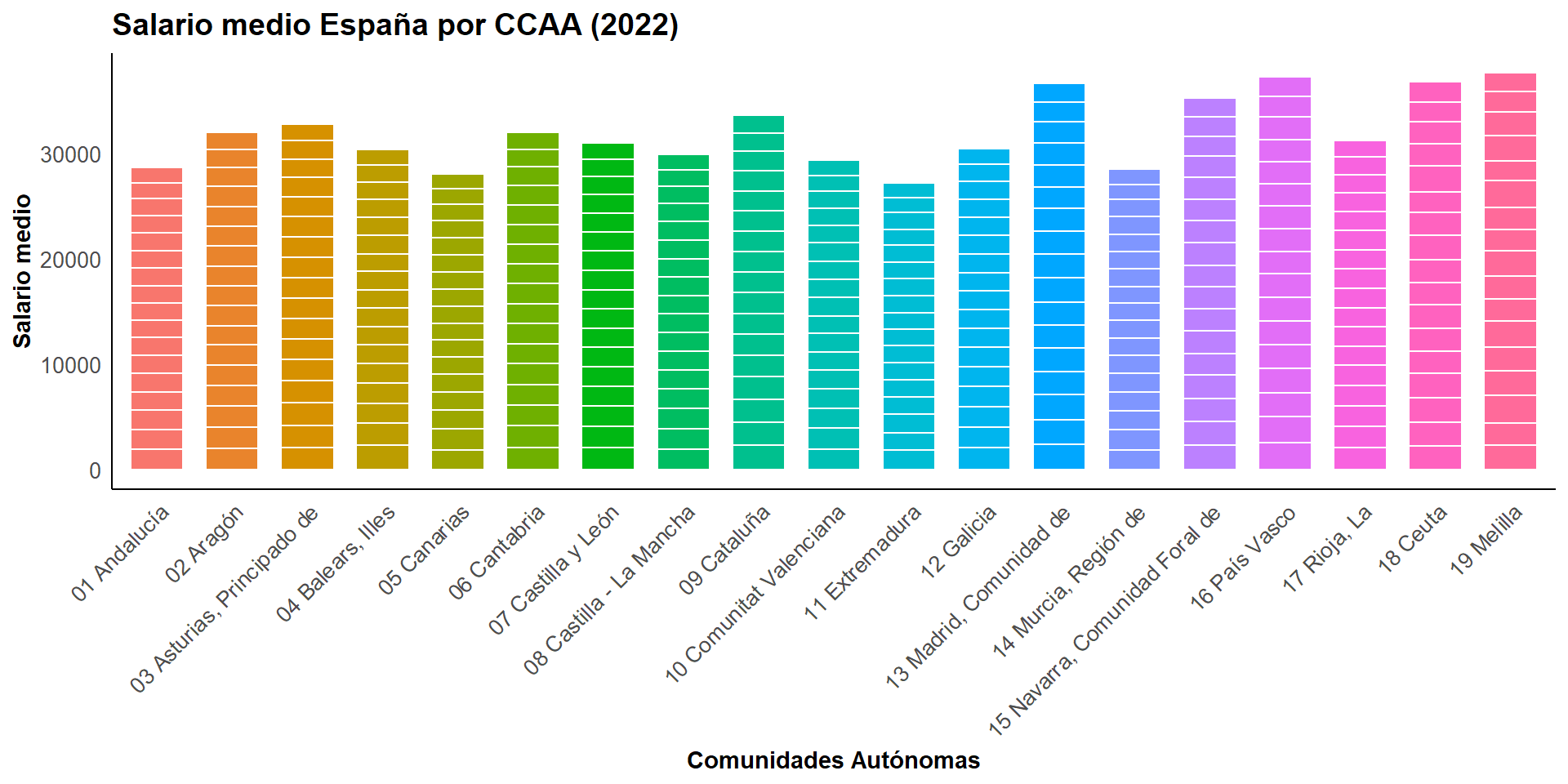 Aquí os dejo un gráfico de barras medio bonito de la distribución salarial en España por CCAA, pero solo de 2022. Al ser el otro en movimiento, dejo este estático con los resultados de 2022 que entiendo que son los más interesantes y actuales.