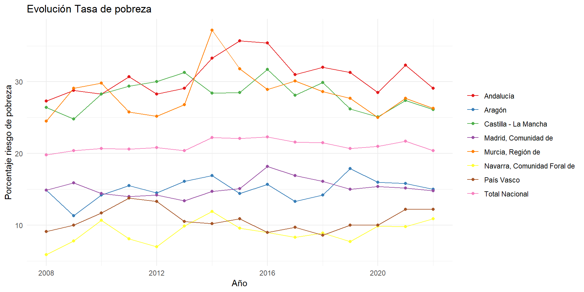 Aquí lo que hemos hecho es un gráfico donde aparece la evolución de la tasa de pobreza de ciertas comunidades, hemos elegido las comunidades con mayor tasa y las que menos (aunque realmente no ha sido tan así, hemos cogido las que nos venían bien para que quedase chulo en el gráfico).