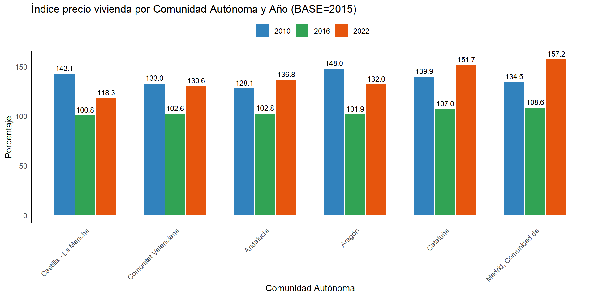 Este gráfico representa el precio de las viviendas por comunidades a lo largo del tiempo con base en el año 2015, como podemos ver en estas comunidades, los precios de la vivienda se están acercando mucho a los de la burbuja de 2008, sobre todo en las comunidades más urbanas.