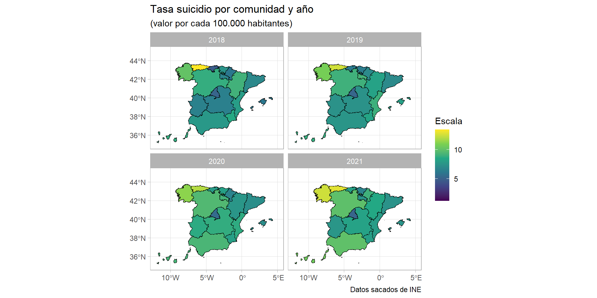 En estos mapas conjuntos representamos la tasa de suicidio por cada 100.000 habitantes clasificados por varios años y comunidades.